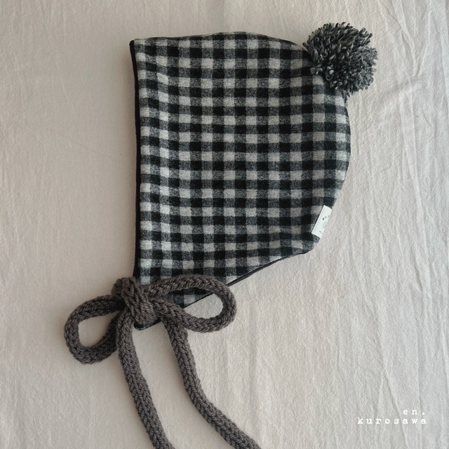 すっぽり可愛い冬のボンネット×グレーブラウンリボン/black and white gingham check