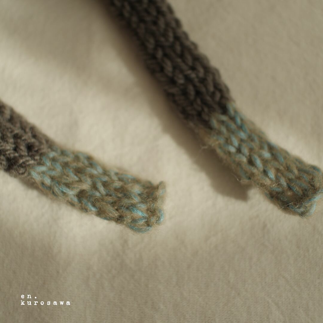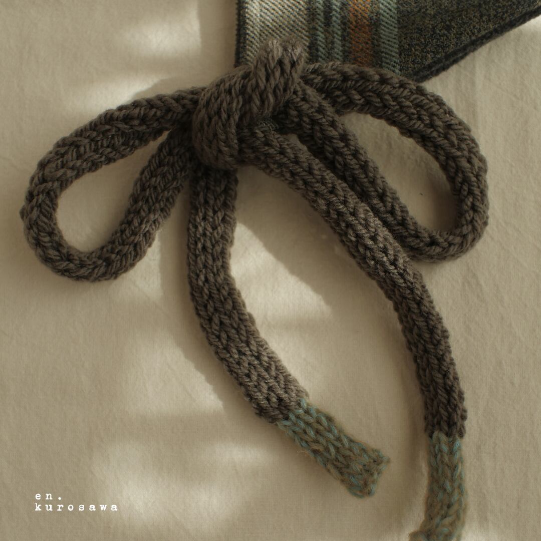 グレーブラウンのリボンの先には、大好きな優しい甘い水色の毛糸を編み込みました⭐︎
