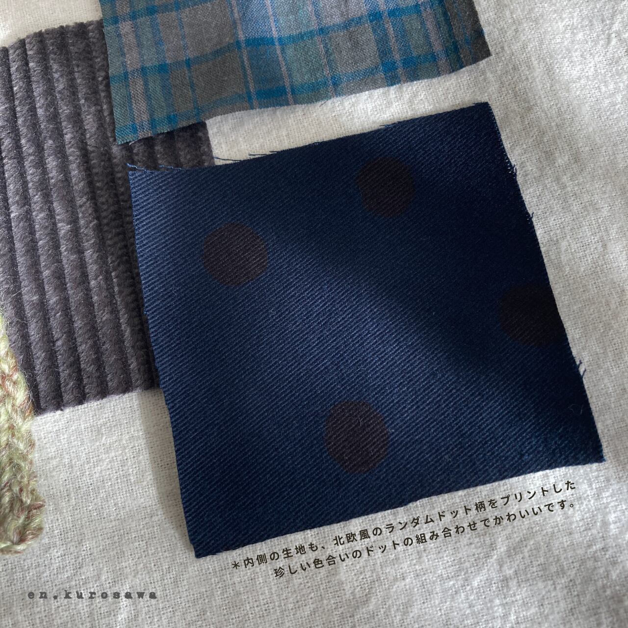 内側には北欧風のランダムドット柄をプリントした、大好きな紺とブラウンのドット柄。さまざまな生地、色の組み合わせにこだわりました⭐︎